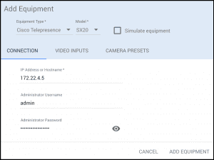 Simply add the Cisco TelePresence system to your room in Mira Portal, select the model number (SX10, SX20, or SX80), and enter the IP address and login credentials. Enable content sharing on the VIDEO INPUTS tab, and select icons and text labels for camera presets from the Camera Presets page, and you are ready to use the room!