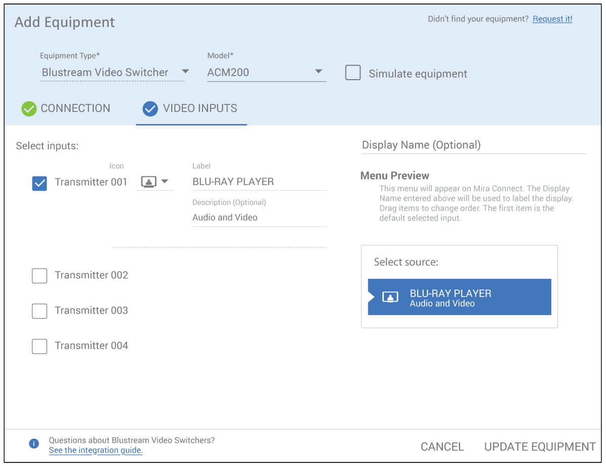 For example, in the following figure, we’ve enabled the first input and called it ‘BLU-RAY PLAYER’ with a description of ‘Audio and Video’. Press ‘UPDATE EQUIPMENT’ when done configuring the video inputs.