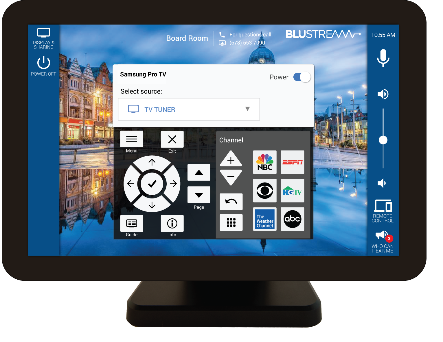 Shown below is an example Mira Connect (with a customized background and logo) controlling one display. If the selected input is a TV tuner, the TV tuner controls are available directly on Mira Connect, making it easy for users to select the source and also control it.
