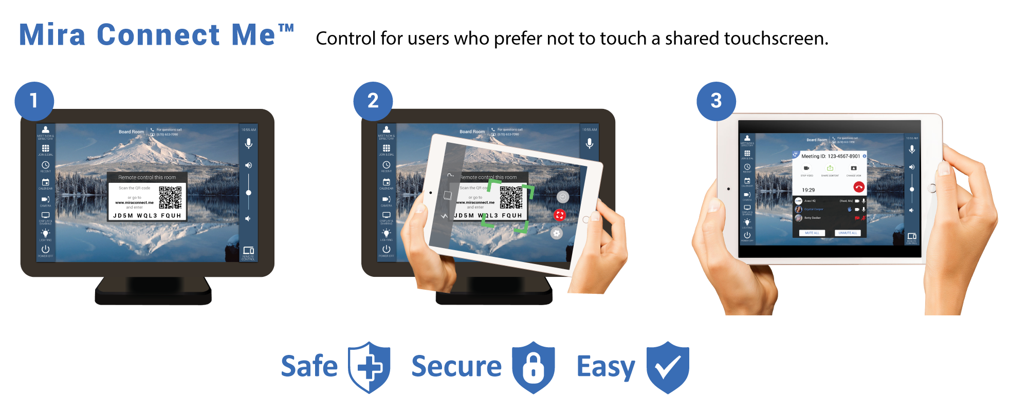 And for room users who prefer not to touch a shared touchscreen or would like to control the room from anywhere in the room, we’ve designed our patent-pending Mira Connect Me so users can quickly, easily, and safely access Mira Connect’s user interface temporarily on their own personal devices without having to touch a shared device.