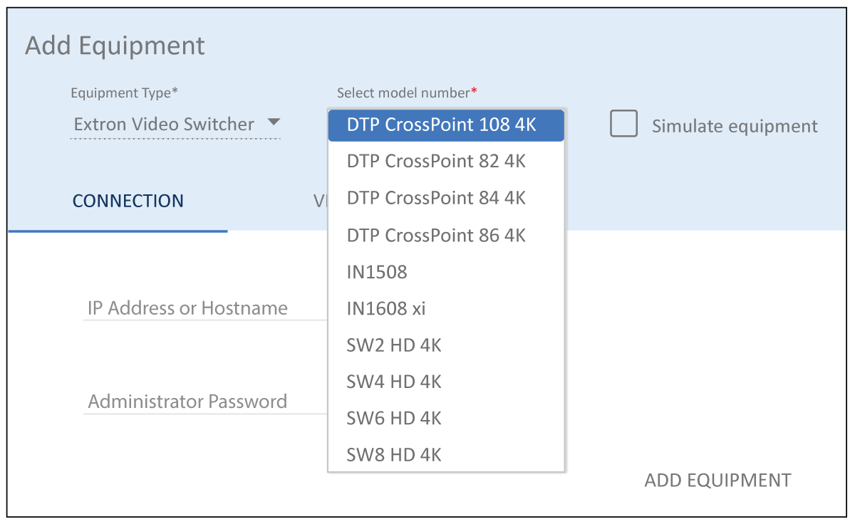 To get started, add an Extron Video Switcher from the equipment list in Mira Portal, our cloud-based management platform for Mira Connect. Select the desired model from the list of models.