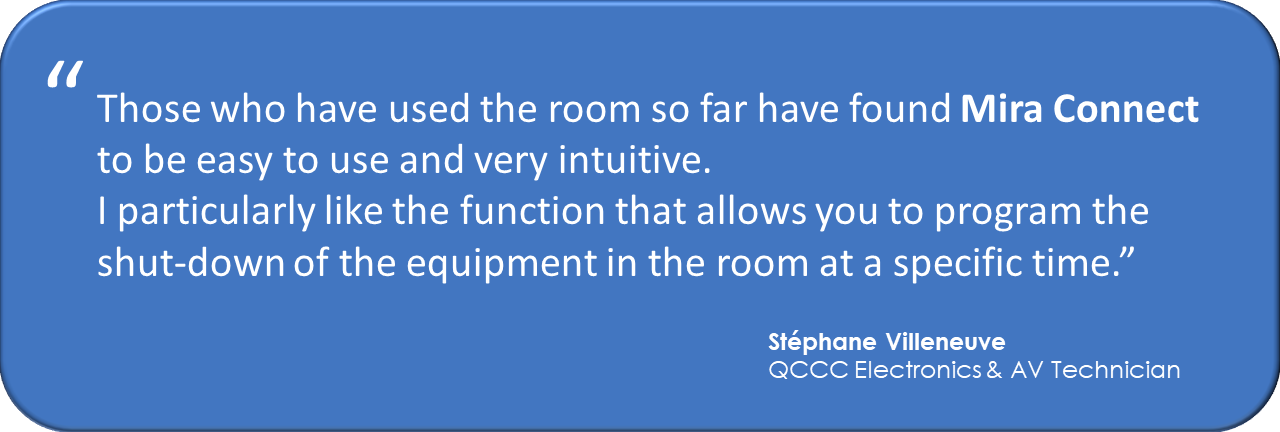 Stéphane Villaneuve led the technical team’s installation work at the Convention Centre. “This installation went well, and we were pleased with the comprehensive documentation,” he said. “Aveo Systems was very helpful; they are fast and very efficient and quickly added equipment that had not previously been supported by Mira Connect. We also wanted some minor changes in the control of some of the equipment in the room.”