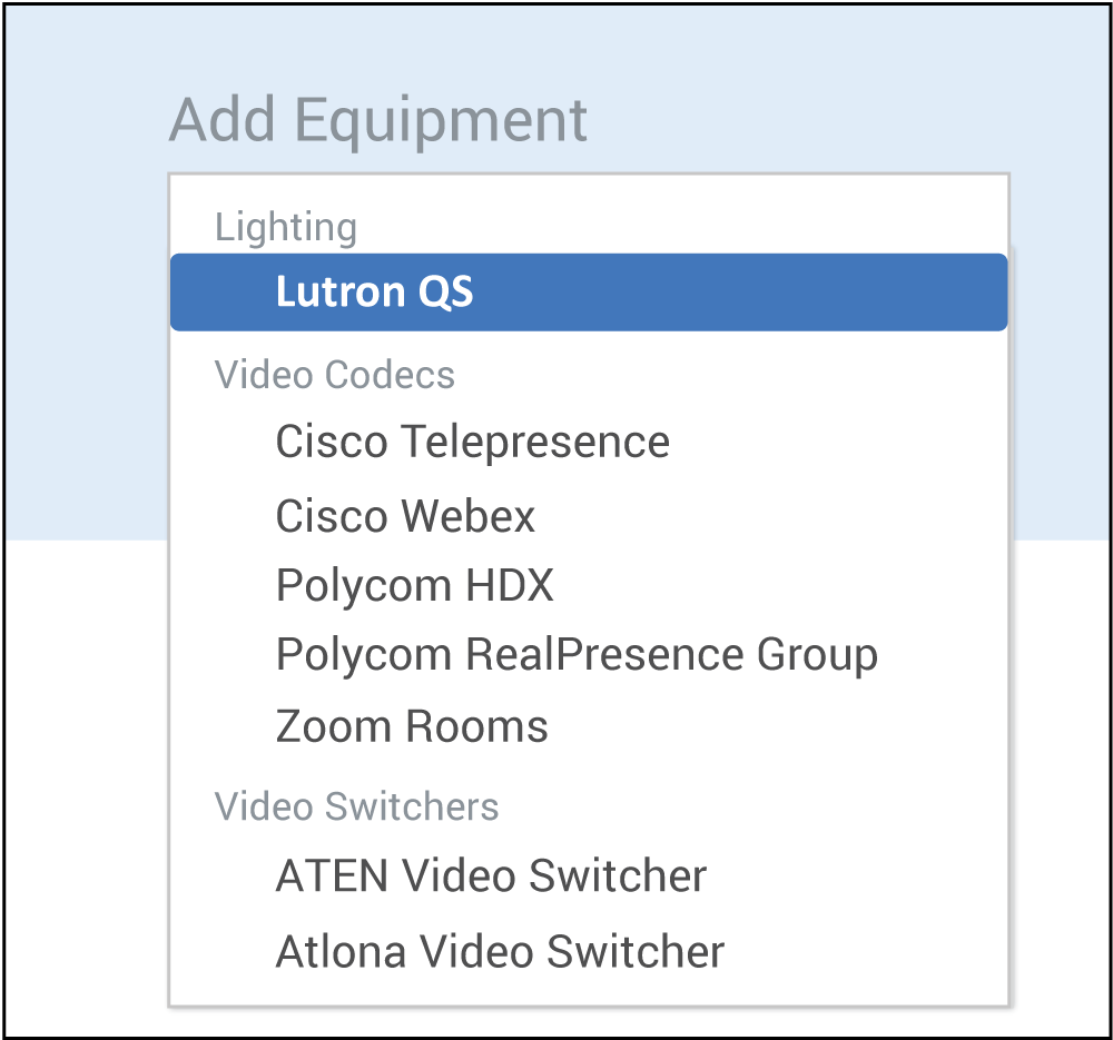 To add a Lutron GRAFIK Eye system to your room, click ADD to open the Add Equipment menu.