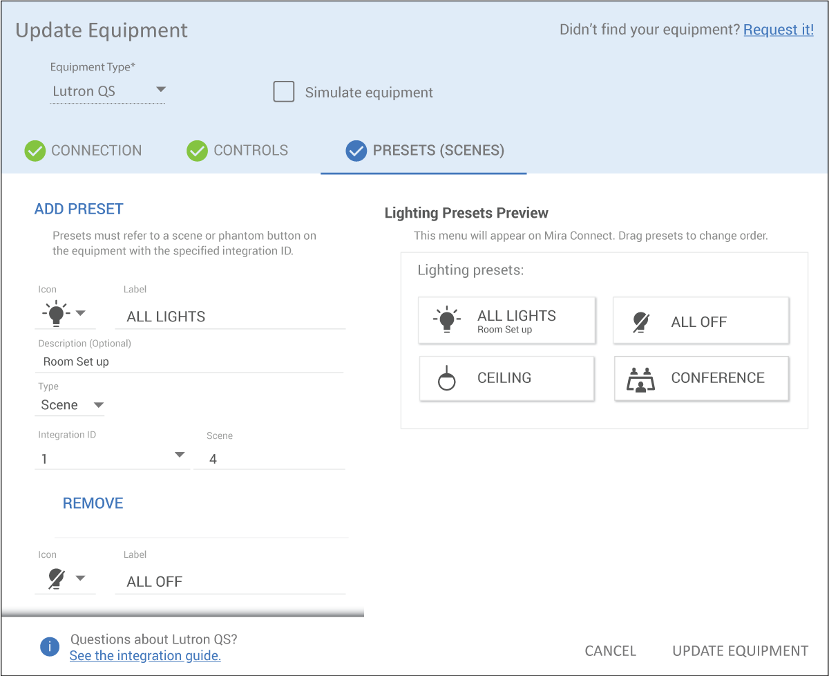 Next, enter the IP address of the Lutron QSE-CI-NWK-E network interface and enter an optional password on the Connection tab. Add the desired lighting controls for zones on the Controls tab and add scenes that are already programmed into the Lutron lighting system on the Presets (Scenes) tab. For each scene, select icons, enter labels and descriptions, and then click Update Equipment to create the user interface on Mira Connect.