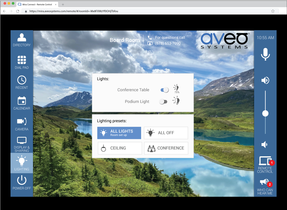 Mira Connect makes it easy for users to select pre-configured lighting scenes (which can include blinds and shades settings) and to adjust individual lighting zones. For example, users can turn on the conferencing lights, dim lights for presentations, or turn off all lights in the room when the meeting is over, all from the Mira Connect touch screen controller.