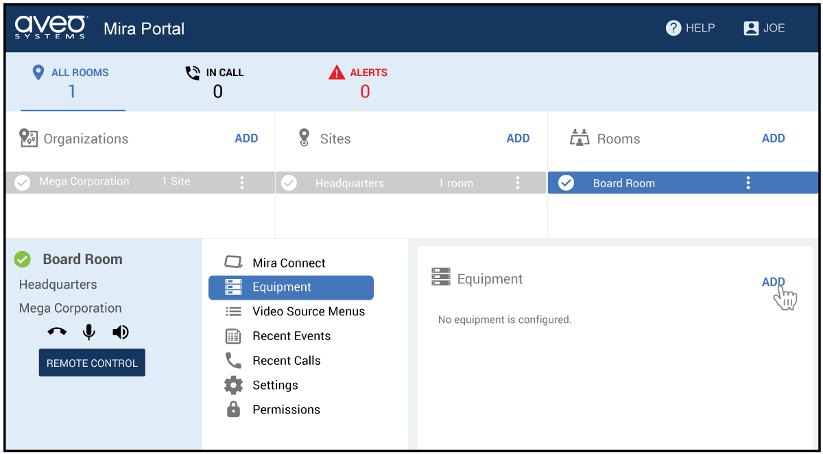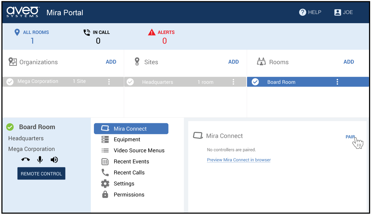 The Mira Connect control system is configured with Mira Portal, Aveo Systems’ cloud-based management platform. Log into Mira Portal and create (or select) the desired organization, site, and room from your dashboard. If you don’t have a Mira Portal account, it’s easy to create one. There is no cost to creating a Mira Portal account to start building systems with Mira Connect.