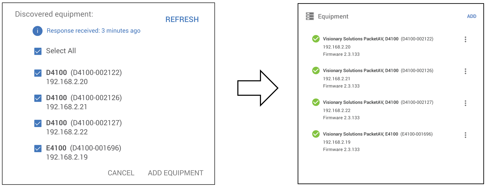 Further streamlining the installation process, Mira Connect automatically discovers the Visionary Solutions PacketAV devices, making it simple to add any number of PacketAV endpoints to the system with one click.