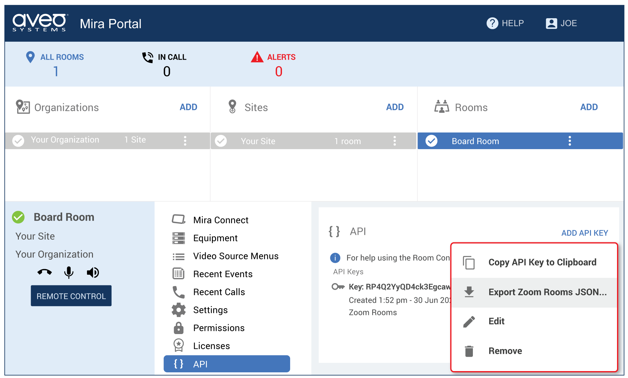 Once you have added and configured the desired AV equipment and options, the next step is to add an API key from the API tab in Mira Portal, if one hasn’t previously been created. Once you have an API key, the room control JSON file can be exported by selecting Export Zoom Rooms JSON… from the API tab.