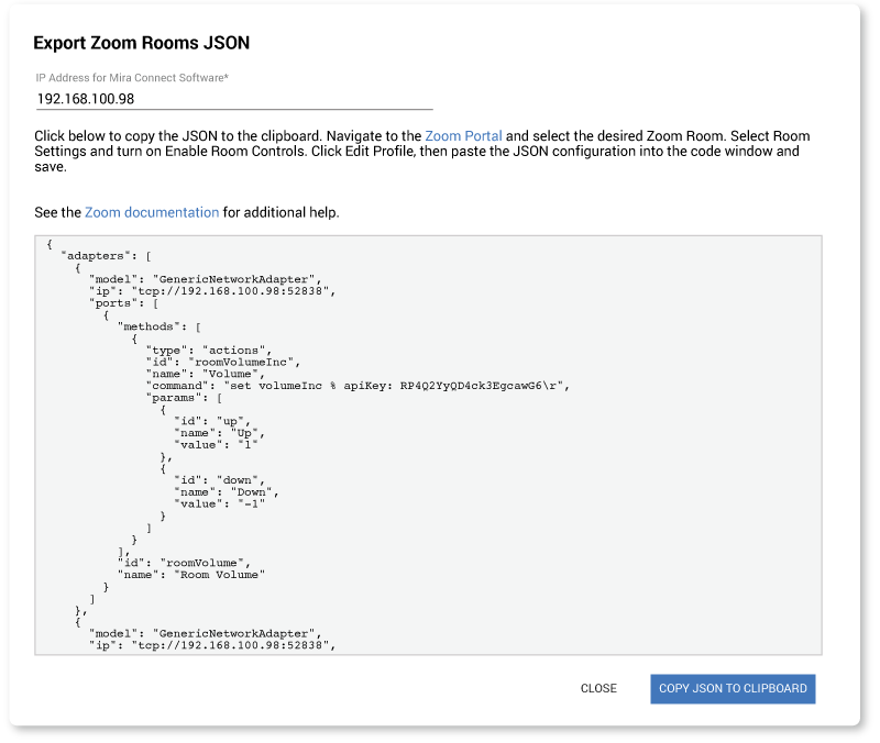 The Export Zoom Rooms JSON… option in Mira Portal generates and previews the Zoom Rooms Native Room Controls JSON file, making it easy to copy the JSON file to your clipboard.