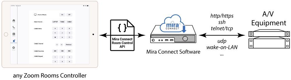 The Zoom Rooms controller sends room control commands to the Mira Connect software, which then controls the AV equipment.