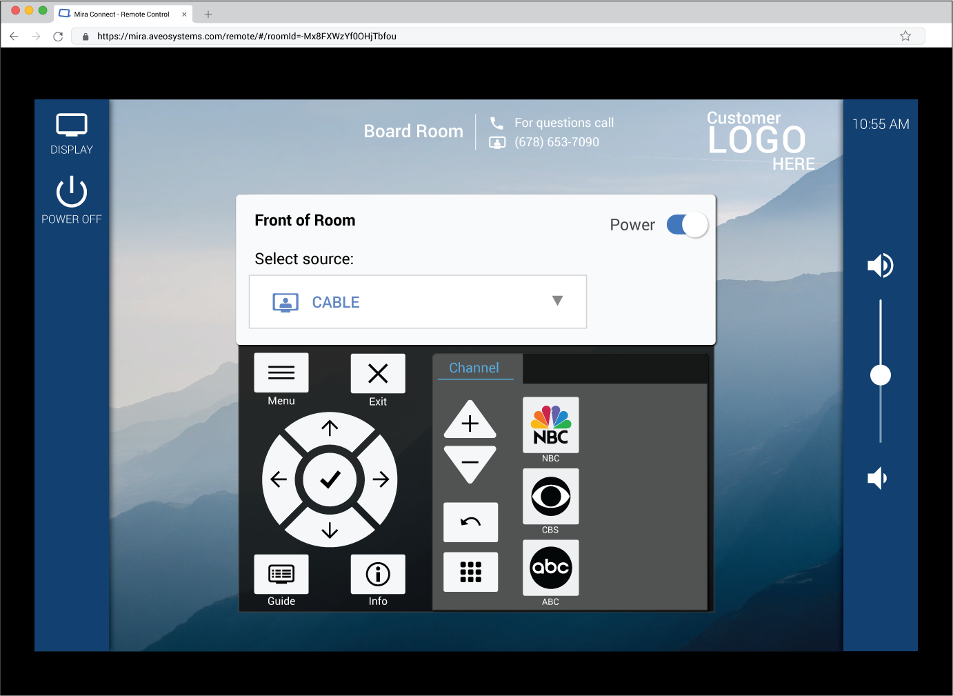 In the following example, a Mira Portal user has already configured a Mira Connect system for a room with a display labeled ‘Front of Room’ and three video inputs labeled: LAPTOP, TABLE, and CABLE. The CABLE input comes from a cable TV receiver (that’s also been added to the system) that supports menu navigation controls, channel up/down and previous selections, channel favorites for fast navigation, and a keypad for directly entering channel numbers.