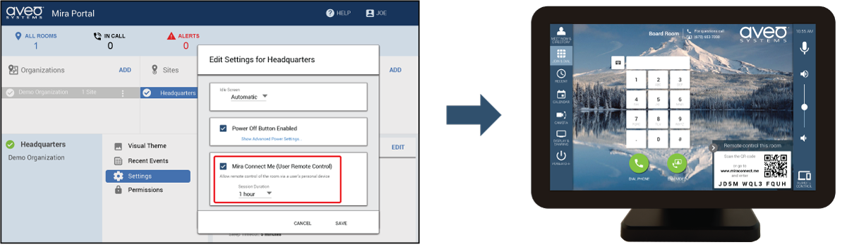 While Mira Connect systems with WAN access already support remote management capability for end users’ help desks, IT departments, and integration partners through Mira Portal, Aveo Systems has extended this remote control functionality directly to Mira Connect users with the introduction of Mira Connect Me.