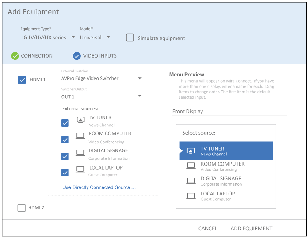 Select ‘Use Sources Connected to Other Equipment…’. Select the AVPro Edge video switcher and then choose the desired output (Out 1 in this example) from the AVPro Edge video switcher that is connected to the display’s input.