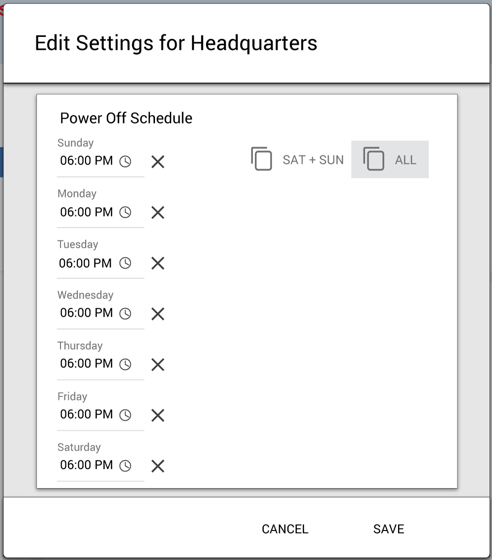 To copy a scheduled time to all days, click the ALL button. All rooms will show the desired power-off time. You can edit the time for individual days.