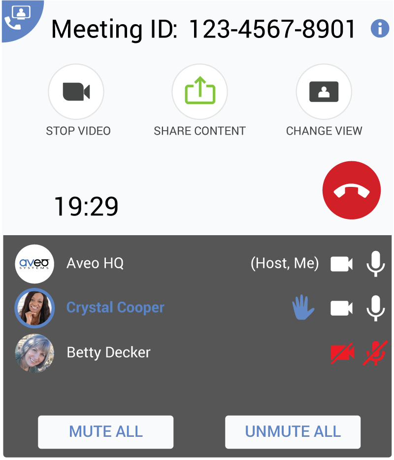 When remote participants raise their hands, Mira Connect will show the status with a blue hand raise status, as shown in the following image. When the remote participants lower their hands, the status returns to normal. This feature is useful for education applications with remote students.