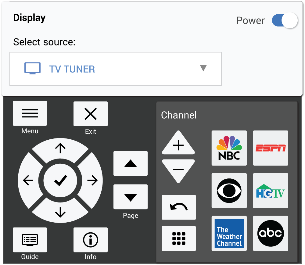 Mira Connect now supports cable, satellite, and off-air tuners. Partners can integrate external cable boxes and associate the tuner outputs with video switcher or displays/projectors. From their Mira Portal dashboard, partners can add the tuner, label the tuner output, define channel favorites, and upload channel icons. Mira Connect will create a user interface as shown below.
