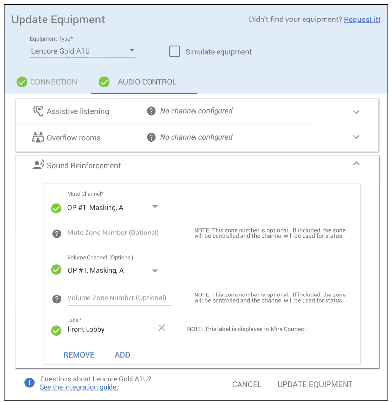 Mira Connect supports sound masking, background music, and paging applications with the Lencore Gold A1U. To control sound masking with the Lencore device, in Mira Portal add the Lencore Gold A1U to the room by selecting it from the Add Equipment option.