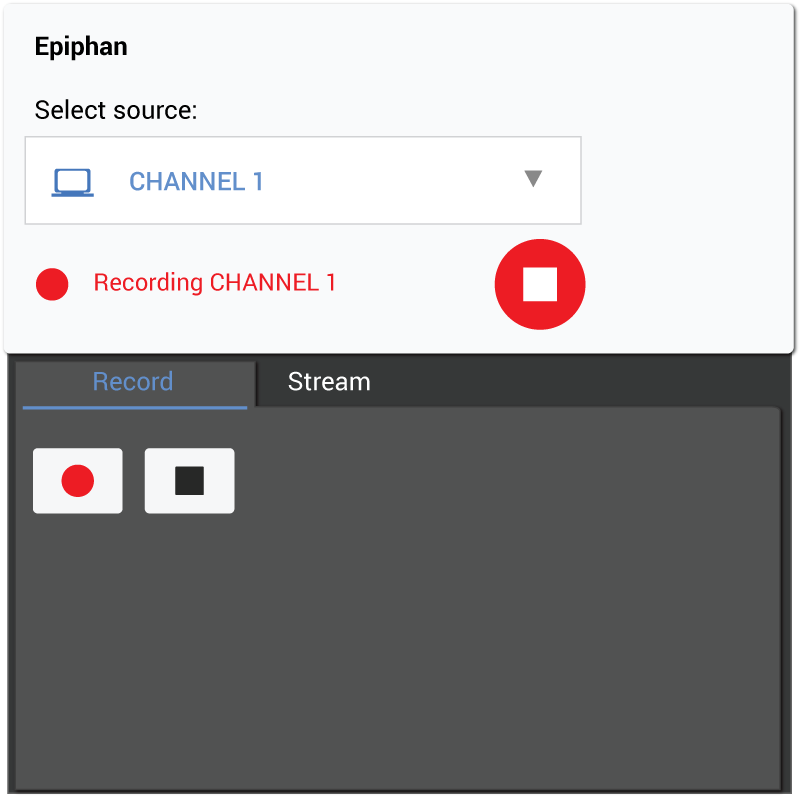 Mira Connect prominently shows which Epiphan channels are recording or streaming on the display card.