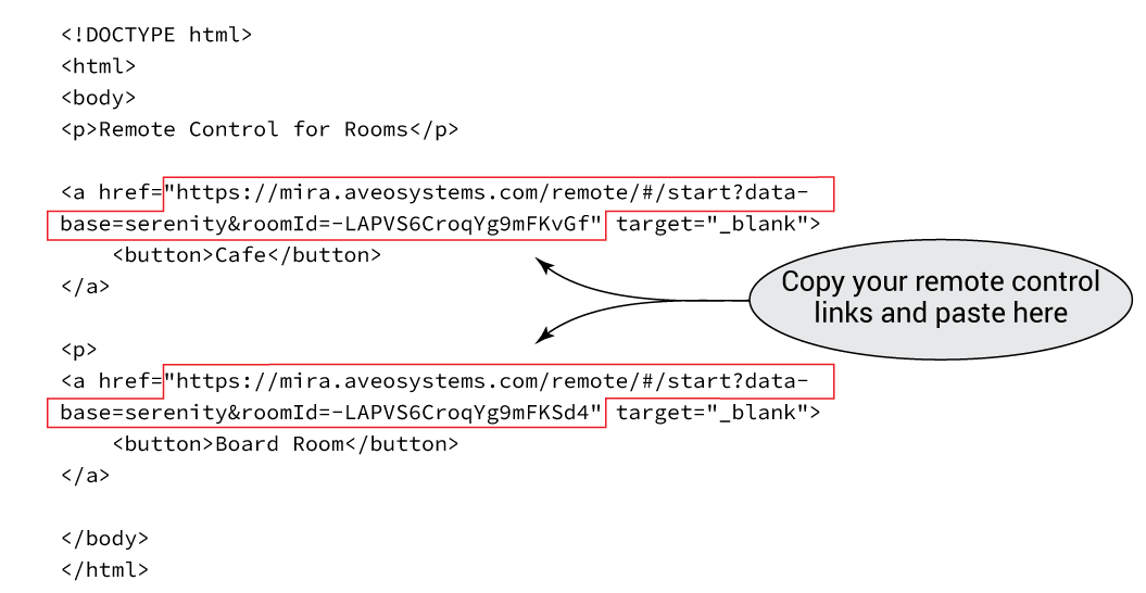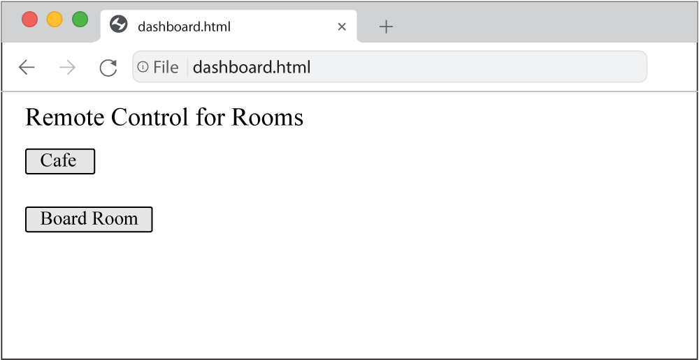 To build a simple dashboard, you can use the <button> command in HTML to create buttons with links to the Remote Control URLs of different rooms, as shown in the following code. Simply paste your Remote Control URL’s into the href field to build your own dashboard.