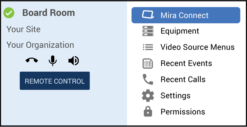 Mira Portal account holders who have Administrator, Technical, or Help Desk permissions on an organization or site can use the Remote Control feature to access the user interface of the rooms in those sites.