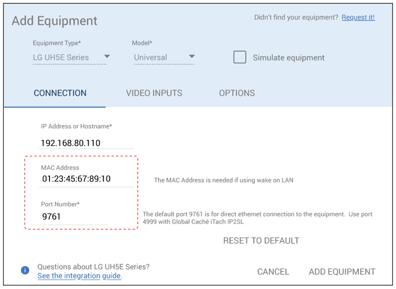 If you are using a Global Cache IP-to-serial device to control a display over its RS-232 interface, enter port number 4999; otherwise use the display’s default communication port. LG professional displays use port 9761 and Sharp Aquos displays use port 10002. Reset To Default will to restore the device’s default port settings. If you’d like to disable Mira Connect’s Wake-on-LAN support for a display, remove the MAC address and click UPDATE EQUIPMENT.